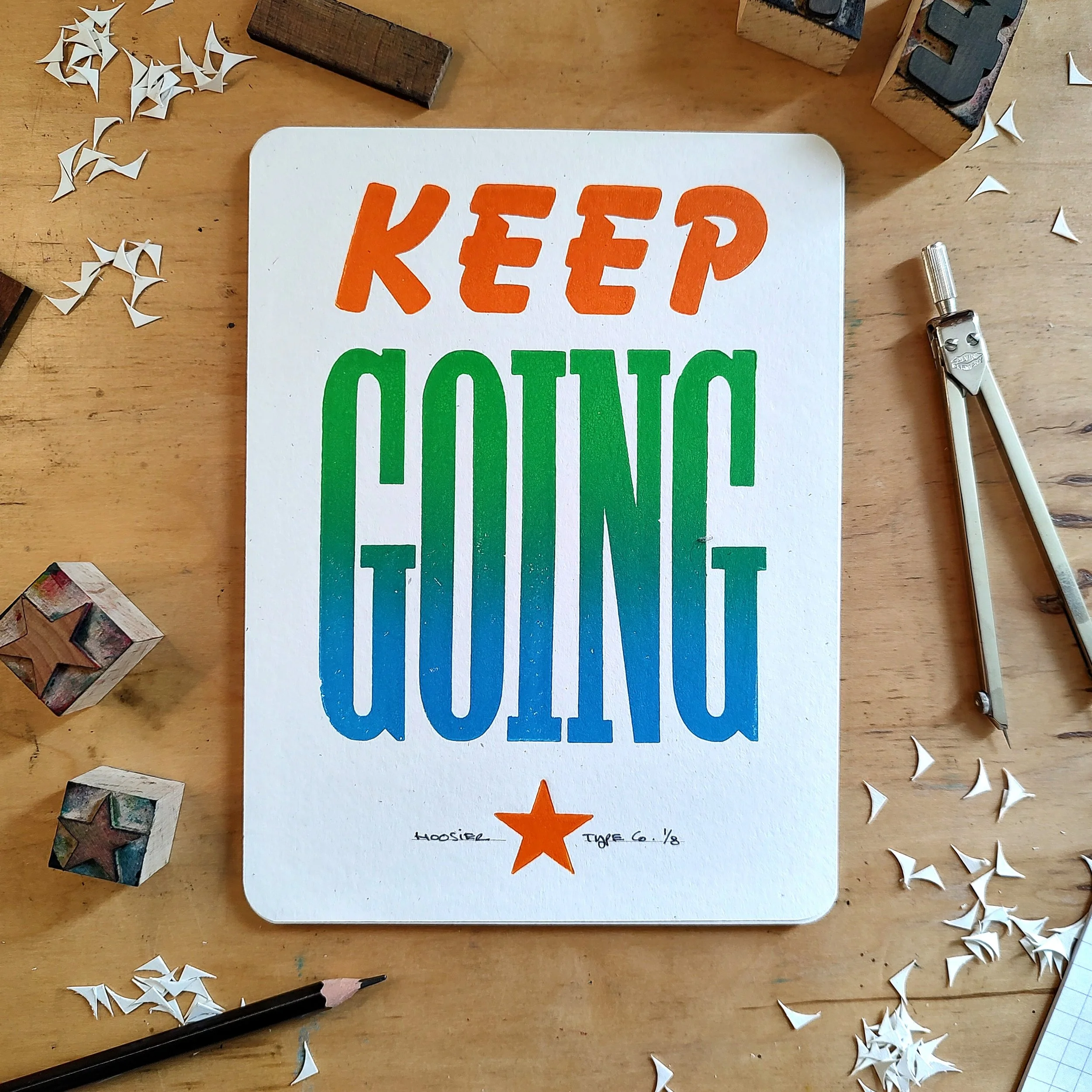 So, I made a very short-term plan as an experiment: I started carving giant 5” letters out of linoleum block and crafted a make-shift lockup in my basement to hand print a short series of 3x4” prints. It was incredibly hard work, but surprisingly they sold!